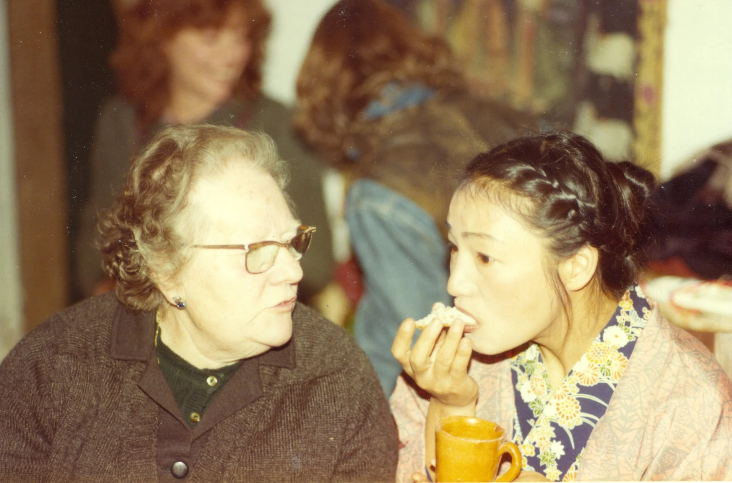 Francisca Rul.lan, propietaria del primer televisor de Deià, con Mitsuko. Detras, Carmen.