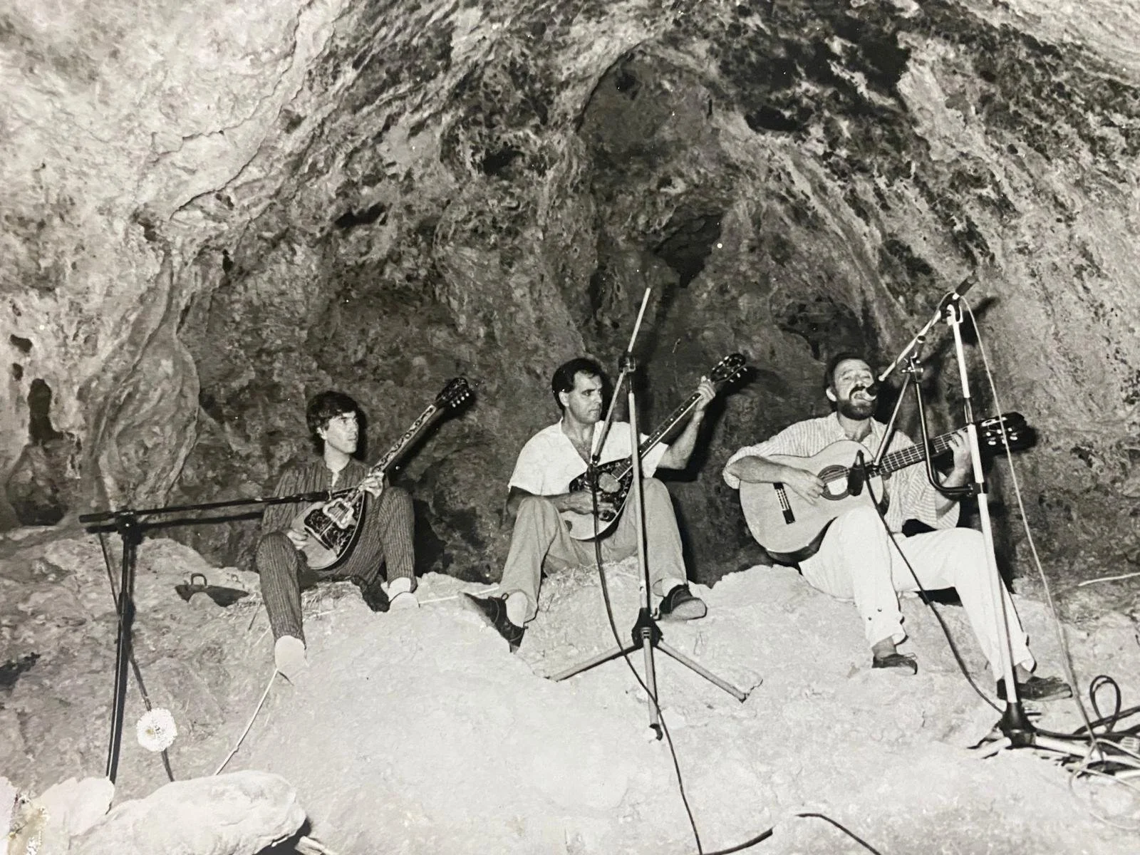 Tomás, Dorín y Toni tocando dentro de una cueva para los peregrinos de La Part Forana a Lluc a Peu a las 4 de la madrugada