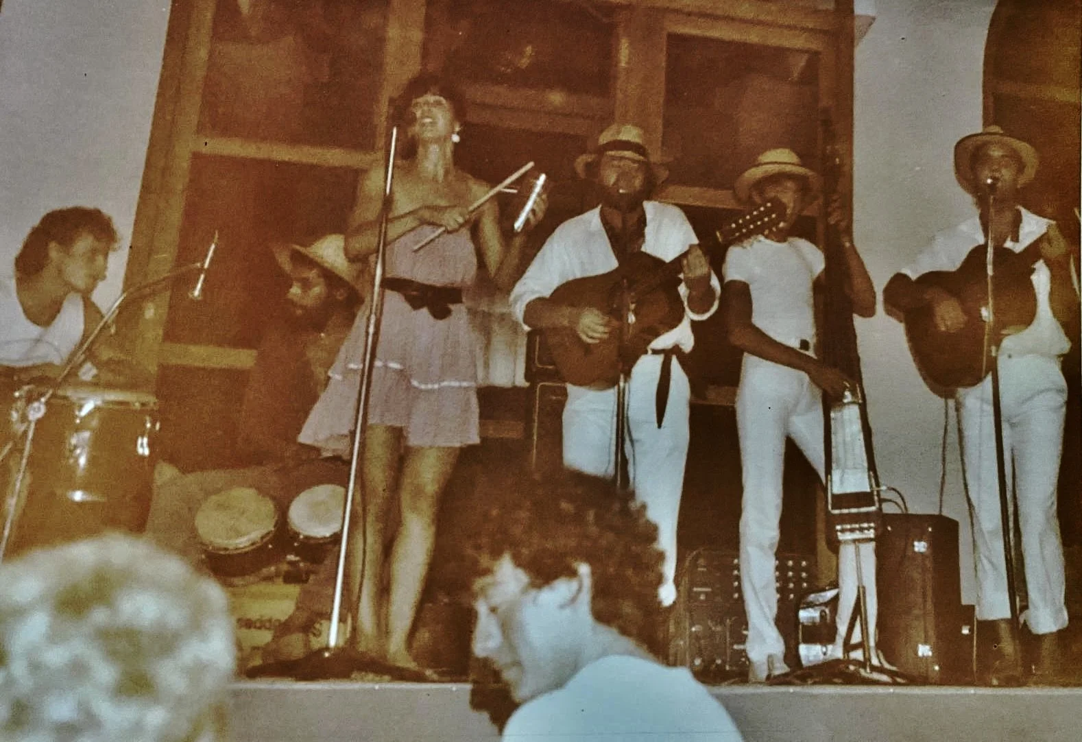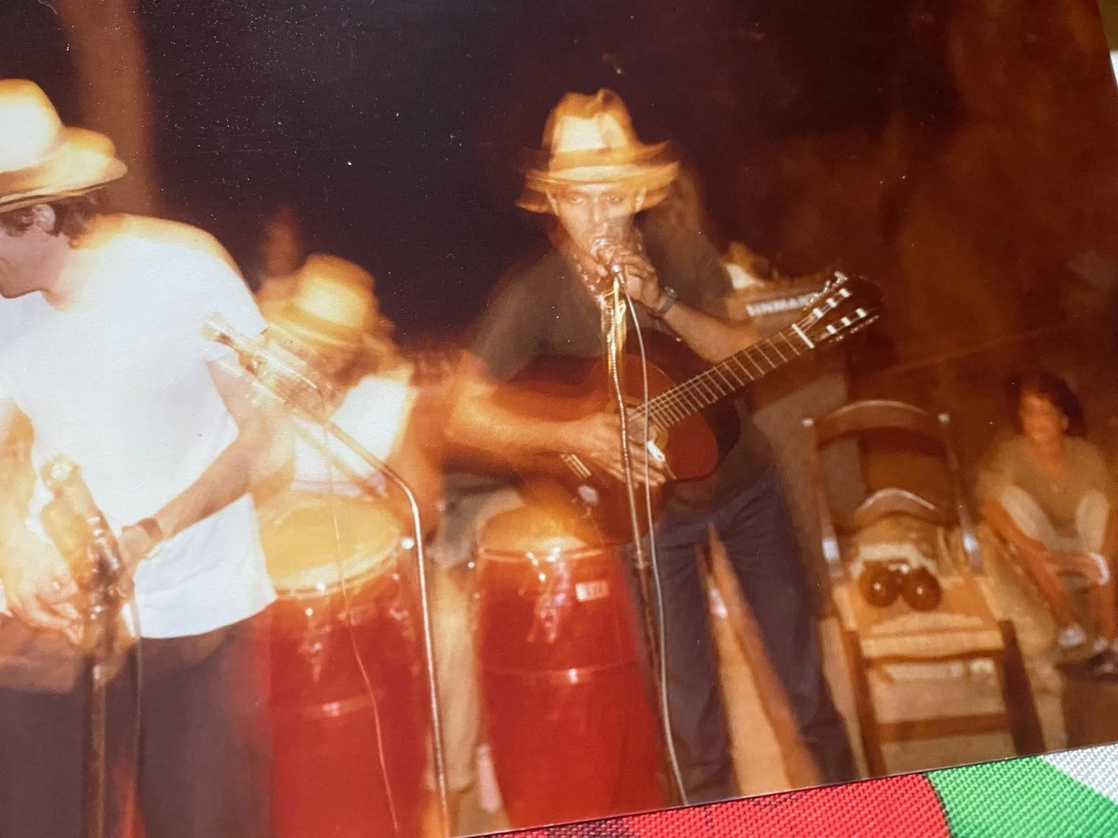 Batabanó en el teatro de Ca n'Alluny: de uzq a der, Toni Morlà (tres) Ramón Farrán (cajas rumberas) Manolito al bajo, Tomás con las claves y detrás de él, Wally Fraza a las congas.